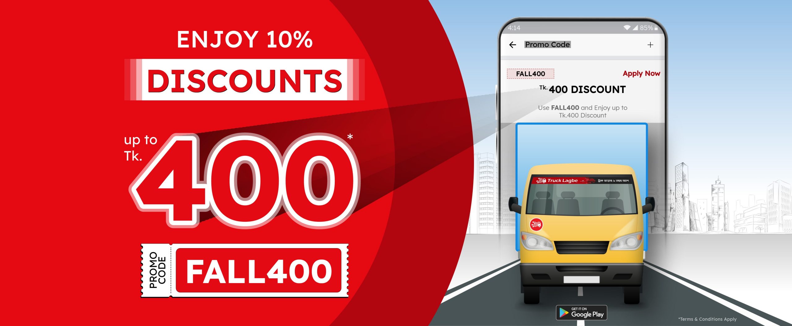 প্রোমো কোড: FALL400 ব্যবহার করে ফিক্সড ট্রিপে উপভোগ করুন ১০% (সর্বোচ্চ ৪০০ টাকা) ছাড়!